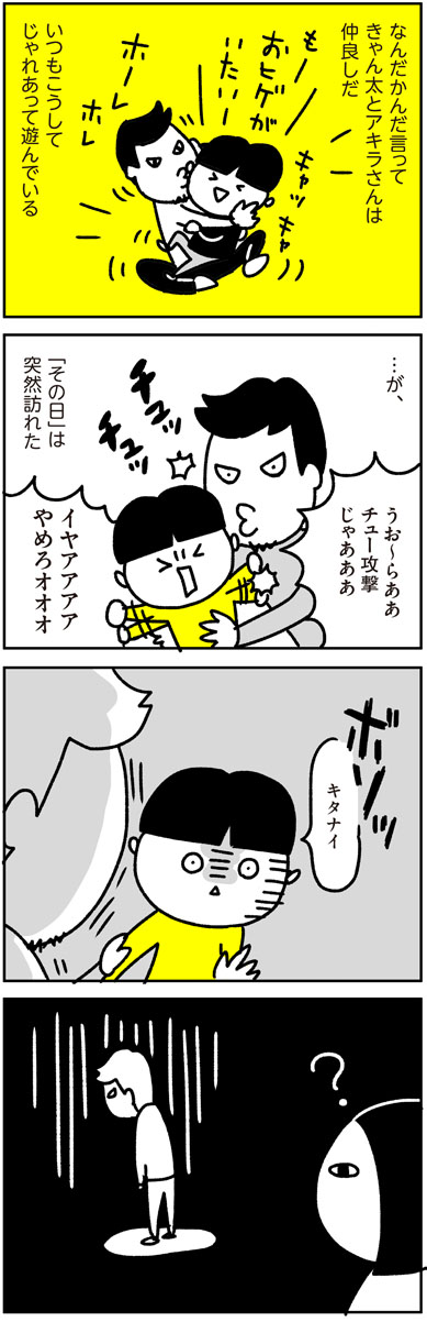 アキラさんの悲劇 2016.01.19 日常漫画 夫アキラ, 息子きゃん太・幼稚園児 悲劇は突然に あとがき でも!でも仲良しです! 2 コメントはこちら 同じカテゴリの記事 入園グッズ(布もの)の準備【コノビー掲載漫画】 セレモニースーツ、どうする?【コノビー掲載漫画】 我が家のサンタヒストリー その5 我が家のサンタヒストリー その4 我が家のサンタヒストリー その3 我が家のサンタヒストリー その2 我が家のサンタヒストリー その1 いつから一人で寝られる?【コノビー掲載漫画】 我が家のハロウィン【コノビー掲載漫画】 初めての授乳の思い出【コノビー掲載漫画】 坊ちゃん刈りからの卒業【コノビー掲載漫画】 胎毛筆の思い出【コノビー掲載漫画】 きゃん太(小2)との日常【コノビー掲載漫画】 ホクロを取った話 その3 ホクロを取った話 その2 ホクロを取った話 その1 ミニトマトの名前 バレンタイン2024 MUGON 粉瘤の話2(後編) 粉瘤の話2(前編) アニメ「進撃の巨人」最終回と我が家(後編) アニメ「進撃の巨人」最終回と我が家(前編) 修学旅行のお土産 だからなんだ絵日記 2023年7~8月 きゃん太と夏休みの宿題 初めてのバイトとカズヨシ【後編】 初めてのバイトとカズヨシ【前編】 クールアンドドライきゃん太 12の夜 映画「THE FIRST SLAM DUNK」観てきた がも 春休みのきゃん太 私が◯◯になっても+お知らせ(レタスクラブ) 節分2023 きゃん太からの苦言 パッキンを届けたら その2 パッキンを届けたら その1 カズヨシ・80歳 その2 カズヨシ・80歳 その1 きゃん太の謎発言とLINEスタンプの宣伝 あだ名クイズ きゃん太の成長期 2年ぶりの健康診断 ちょっ子ちゃん〜顔のケガの思い出 後編〜 ちょっ子ちゃん〜顔のケガの思い出 前編〜 きゃん太の忘れもの きゃん太という男 粉瘤の話 猫の名前 そんなんじゃない きゃん太とセミ きゃん太と若冲 きゃん太の気がかりなこと 都道府県を体で表現する遊び ケーキの代わり きゃん太と進撃の巨人 アニメ「進撃の巨人」にハマった話 「劇場版 鬼滅の刃 無限列車編」観てきた Switchで桃鉄始めました きゃん太と鬼滅の刃 キングダムにハマった家族の風景 母の靴(3) 母の靴(2) 母の靴 (1) 最近のスタイル2 最近のスタイル こわいよ こわいよ きゃん太の夢(9歳現在) 続々・気を遣うきゃん太 ケンカの仲裁 誕生日のプレゼント 毛穴の話 休校中のきゃん太 つないだ手 2020年 年始のきゃん太 クリスマスのお菓子 オオサンショウウオ(の ぬいぐるみ)が来た 予防接種にて〜2019〜 気になる帽子 愛のことば きゃん太のアダ名センス 父の愛4 ママの代わりに バイトの思い出 ゲーム中のきゃん太 カズヨシ・メソッド(後編) カズヨシ・メソッド(前編)とウーマンエキサイト挿絵 母の日のこと 2019 GWの思い出 きゃん太と新元号+ウーマンエキサイト記事挿絵 きゃん太と漢字 ボヘミアンラプソディとバナナフィッシュ きゃん太の不安 初詣ときゃん太 続・気を遣うきゃん太 気を遣うきゃん太 ちょっ子ちゃん〜氷砂糖の思い出 後編〜 ちょっ子ちゃん〜氷砂糖の思い出 前編〜 きゃん太のボキャブラリー きゃん太、迷子になる② きゃん太、迷子になる① きゃん太へのごほうび アキラさんの口笛 ◯◯◯◯の呼び方 恐竜の夏 きゃん太の言い回し きゃん太のジャスティス 父の愛3 アヒル口 きゃん太の反抗期 小僧ずラブ おなかがいたい きゃん太との再会 オトナなきゃん太 ママと結婚できなくても きゃん太とインフルエンザ 雪の日のきゃん太 ちょっ子ちゃん〜カズヨシとクリスマス後編〜 ちょっ子ちゃん 〜カズヨシとクリスマス前編〜 サンタへの感謝 ウォーキングデッド脳 きゃん太と相撲 笑顔を見せて アキラさんと腹筋ベルト(+ウォーキングデッドの話) if 〜もしも〜(+ウパ男の話) きゃん太の変化 きゃん太と運動会のお弁当 きゃん太の落ち着く香り ふたりの暗号 きゃん太のツッコミ きゃん太とサプライズ おっちゃんの似顔絵 あのころは 化石発掘体験 きゃん太のお泊まり おしりペンペン 新しい服 虫採りの流儀 僕はやってない どう思ってるの きゃん太の夢 父の愛2 二人の秘密 きゃん太のあっちむいてホイ ゆうすけくん 父の愛 きゃん太のごっこ遊び さいごの日 おやすみのチュー きゃん太と自転車 あたらしい言葉 PPAP きゃん太ver. パパの呼び方 豆まきの意義 予防接種にて ちょっ子さんの失敗 人間嫌い 言ってほしい ちょっ子さんちのクリスマス② ちょっ子さんちのクリスマス① きゃん太とあこがれの人② きゃん太とあこがれの人 言いたいこと 立派な◯◯◯ 女子ときゃん太とブログ一周年 きゃん太の芸の道 ちょっ子さんの秘密 ママの料理 きゃん太・その愛 〜2016 秋〜 まりやちゃんの想い きゃん太とロボザウルス トイレに行きたい きゃん太の学び 断乳した時の話 ママのおなかは 愛と裏切りのきゃん太 きゃん太と買い物 恐怖の夜 夏のアキラさん 父の肖像 きゃん太の新技 言うと思った 噛まずに言えるかな アキラさんのダイエット 大人の階段登るきゃん太 きゃん太とお絵描き きゃん太の腕相撲 カズヨシという男(父の
