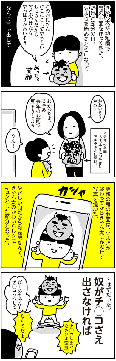 節分の話 2016.02.08 日常漫画 息子きゃん太・幼稚園児 鬼のお面 あとがき 途中までいい話だったんだけどな〜〜〜〜 3 コメントはこちら 同じカテゴリの記事 入園グッズ(布もの)の準備【コノビー掲載漫画】 セレモニースーツ、どうする?【コノビー掲載漫画】 我が家のサンタヒストリー その5 我が家のサンタヒストリー その4 我が家のサンタヒストリー その3 我が家のサンタヒストリー その2 我が家のサンタヒストリー その1 いつから一人で寝られる?【コノビー掲載漫画】 我が家のハロウィン【コノビー掲載漫画】 初めての授乳の思い出【コノビー掲載漫画】 坊ちゃん刈りからの卒業【コノビー掲載漫画】 胎毛筆の思い出【コノビー掲載漫画】 きゃん太(小2)との日常【コノビー掲載漫画】 ホクロを取った話 その3 ホクロを取った話 その2 ホクロを取った話 その1 ミニトマトの名前 バレンタイン2024 MUGON 粉瘤の話2(後編) 粉瘤の話2(前編) アニメ「進撃の巨人」最終回と我が家(後編) アニメ「進撃の巨人」最終回と我が家(前編) 修学旅行のお土産 だからなんだ絵日記 2023年7~8月 きゃん太と夏休みの宿題 初めてのバイトとカズヨシ【後編】 初めてのバイトとカズヨシ【前編】 クールアンドドライきゃん太 12の夜 映画「THE FIRST SLAM DUNK」観てきた がも 春休みのきゃん太 私が◯◯になっても+お知らせ(レタスクラブ) 節分2023 きゃん太からの苦言 パッキンを届けたら その2 パッキンを届けたら その1 カズヨシ・80歳 その2 カズヨシ・80歳 その1 きゃん太の謎発言とLINEスタンプの宣伝 あだ名クイズ きゃん太の成長期 2年ぶりの健康診断 ちょっ子ちゃん〜顔のケガの思い出 後編〜 ちょっ子ちゃん〜顔のケガの思い出 前編〜 きゃん太の忘れもの きゃん太という男 粉瘤の話 猫の名前 そんなんじゃない きゃん太とセミ きゃん太と若冲 きゃん太の気がかりなこと 都道府県を体で表現する遊び ケーキの代わり きゃん太と進撃の巨人 アニメ「進撃の巨人」にハマった話 「劇場版 鬼滅の刃 無限列車編」観てきた Switchで桃鉄始めました きゃん太と鬼滅の刃 キングダムにハマった家族の風景 母の靴(3) 母の靴(2) 母の靴 (1) 最近のスタイル2 最近のスタイル こわいよ こわいよ きゃん太の夢(9歳現在) 続々・気を遣うきゃん太 ケンカの仲裁 誕生日のプレゼント 毛穴の話 休校中のきゃん太 つないだ手 2020年 年始のきゃん太 クリスマスのお菓子 オオサンショウウオ(の ぬいぐるみ)が来た 予防接種にて〜2019〜 気になる帽子 愛のことば きゃん太のアダ名センス 父の愛4 ママの代わりに バイトの思い出 ゲーム中のきゃん太 カズヨシ・メソッド(後編) カズヨシ・メソッド(前編)とウーマンエキサイト挿絵 母の日のこと 2019 GWの思い出 きゃん太と新元号+ウーマンエキサイト記事挿絵 きゃん太と漢字 ボヘミアンラプソディとバナナフィッシュ きゃん太の不安 初詣ときゃん太 続・気を遣うきゃん太 気を遣うきゃん太 ちょっ子ちゃん〜氷砂糖の思い出 後編〜 ちょっ子ちゃん〜氷砂糖の思い出 前編〜 きゃん太のボキャブラリー きゃん太、迷子になる② きゃん太、迷子になる① きゃん太へのごほうび アキラさんの口笛 ◯◯◯◯の呼び方 恐竜の夏 きゃん太の言い回し きゃん太のジャスティス 父の愛3 アヒル口 きゃん太の反抗期 小僧ずラブ おなかがいたい きゃん太との再会 オトナなきゃん太 ママと結婚できなくても きゃん太とインフルエンザ 雪の日のきゃん太 ちょっ子ちゃん〜カズヨシとクリスマス後編〜 ちょっ子ちゃん 〜カズヨシとクリスマス前編〜 サンタへの感謝 ウォーキングデッド脳 きゃん太と相撲 笑顔を見せて アキラさんと腹筋ベルト(+ウォーキングデッドの話) if 〜もしも〜(+ウパ男の話) きゃん太の変化 きゃん太と運動会のお弁当 きゃん太の落ち着く香り ふたりの暗号 きゃん太のツッコミ きゃん太とサプライズ おっちゃんの似顔絵 あのころは 化石発掘体験 きゃん太のお泊まり おしりペンペン 新しい服 虫採りの流儀 僕はやってない どう思ってるの きゃん太の夢 父の愛2 二人の秘密 きゃん太のあっちむいてホイ ゆうすけくん 父の愛 きゃん太のごっこ遊び さいごの日 おやすみのチュー きゃん太と自転車 あたらしい言葉 PPAP きゃん太ver. パパの呼び方 豆まきの意義 予防接種にて ちょっ子さんの失敗 人間嫌い 言ってほしい ちょっ子さんちのクリスマス② ちょっ子さんちのクリスマス① きゃん太とあこがれの人② きゃん太とあこがれの人 言いたいこと 立派な◯◯◯ 女子ときゃん太とブログ一周年 きゃん太の芸の道 ちょっ子さんの秘密 ママの料理 きゃん太・その愛 〜2016 秋〜 まりやちゃんの想い きゃん太とロボザウルス トイレに行きたい きゃん太の学び 断乳した時の話 ママのおなかは 愛と裏切りのきゃん太 きゃん太と買い物 恐怖の夜 夏のアキラさん 父の肖像 きゃん太の新技 言うと思った 噛まずに言えるかな アキラさんのダイエット 大人の階段登るきゃん太 きゃん太とお絵描き きゃん太の腕相撲 カズヨシという男(父の日の
