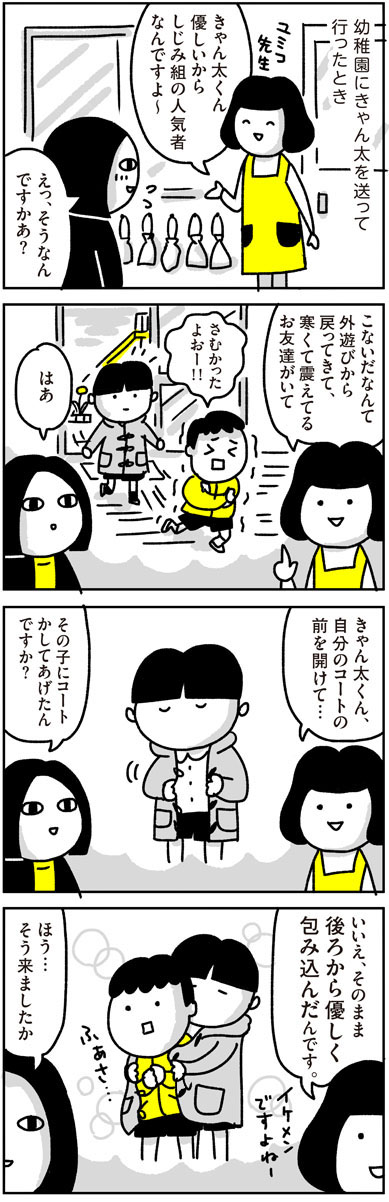 ロマンティックきゃん太 2016.02.19 日常漫画 息子きゃん太・幼稚園児 ある寒い日 あとがき アイツそういうとこあるんですよね。 3 コメントはこちら 同じカテゴリの記事 入園グッズ(布もの)の準備【コノビー掲載漫画】 セレモニースーツ、どうする?【コノビー掲載漫画】 我が家のサンタヒストリー その5 我が家のサンタヒストリー その4 我が家のサンタヒストリー その3 我が家のサンタヒストリー その2 我が家のサンタヒストリー その1 いつから一人で寝られる?【コノビー掲載漫画】 我が家のハロウィン【コノビー掲載漫画】 初めての授乳の思い出【コノビー掲載漫画】 坊ちゃん刈りからの卒業【コノビー掲載漫画】 胎毛筆の思い出【コノビー掲載漫画】 きゃん太(小2)との日常【コノビー掲載漫画】 ホクロを取った話 その3 ホクロを取った話 その2 ホクロを取った話 その1 ミニトマトの名前 バレンタイン2024 MUGON 粉瘤の話2(後編) 粉瘤の話2(前編) アニメ「進撃の巨人」最終回と我が家(後編) アニメ「進撃の巨人」最終回と我が家(前編) 修学旅行のお土産 だからなんだ絵日記 2023年7~8月 きゃん太と夏休みの宿題 初めてのバイトとカズヨシ【後編】 初めてのバイトとカズヨシ【前編】 クールアンドドライきゃん太 12の夜 映画「THE FIRST SLAM DUNK」観てきた がも 春休みのきゃん太 私が◯◯になっても+お知らせ(レタスクラブ) 節分2023 きゃん太からの苦言 パッキンを届けたら その2 パッキンを届けたら その1 カズヨシ・80歳 その2 カズヨシ・80歳 その1 きゃん太の謎発言とLINEスタンプの宣伝 あだ名クイズ きゃん太の成長期 2年ぶりの健康診断 ちょっ子ちゃん〜顔のケガの思い出 後編〜 ちょっ子ちゃん〜顔のケガの思い出 前編〜 きゃん太の忘れもの きゃん太という男 粉瘤の話 猫の名前 そんなんじゃない きゃん太とセミ きゃん太と若冲 きゃん太の気がかりなこと 都道府県を体で表現する遊び ケーキの代わり きゃん太と進撃の巨人 アニメ「進撃の巨人」にハマった話 「劇場版 鬼滅の刃 無限列車編」観てきた Switchで桃鉄始めました きゃん太と鬼滅の刃 キングダムにハマった家族の風景 母の靴(3) 母の靴(2) 母の靴 (1) 最近のスタイル2 最近のスタイル こわいよ こわいよ きゃん太の夢(9歳現在) 続々・気を遣うきゃん太 ケンカの仲裁 誕生日のプレゼント 毛穴の話 休校中のきゃん太 つないだ手 2020年 年始のきゃん太 クリスマスのお菓子 オオサンショウウオ(の ぬいぐるみ)が来た 予防接種にて〜2019〜 気になる帽子 愛のことば きゃん太のアダ名センス 父の愛4 ママの代わりに バイトの思い出 ゲーム中のきゃん太 カズヨシ・メソッド(後編) カズヨシ・メソッド(前編)とウーマンエキサイト挿絵 母の日のこと 2019 GWの思い出 きゃん太と新元号+ウーマンエキサイト記事挿絵 きゃん太と漢字 ボヘミアンラプソディとバナナフィッシュ きゃん太の不安 初詣ときゃん太 続・気を遣うきゃん太 気を遣うきゃん太 ちょっ子ちゃん〜氷砂糖の思い出 後編〜 ちょっ子ちゃん〜氷砂糖の思い出 前編〜 きゃん太のボキャブラリー きゃん太、迷子になる② きゃん太、迷子になる① きゃん太へのごほうび アキラさんの口笛 ◯◯◯◯の呼び方 恐竜の夏 きゃん太の言い回し きゃん太のジャスティス 父の愛3 アヒル口 きゃん太の反抗期 小僧ずラブ おなかがいたい きゃん太との再会 オトナなきゃん太 ママと結婚できなくても きゃん太とインフルエンザ 雪の日のきゃん太 ちょっ子ちゃん〜カズヨシとクリスマス後編〜 ちょっ子ちゃん 〜カズヨシとクリスマス前編〜 サンタへの感謝 ウォーキングデッド脳 きゃん太と相撲 笑顔を見せて アキラさんと腹筋ベルト(+ウォーキングデッドの話) if 〜もしも〜(+ウパ男の話) きゃん太の変化 きゃん太と運動会のお弁当 きゃん太の落ち着く香り ふたりの暗号 きゃん太のツッコミ きゃん太とサプライズ おっちゃんの似顔絵 あのころは 化石発掘体験 きゃん太のお泊まり おしりペンペン 新しい服 虫採りの流儀 僕はやってない どう思ってるの きゃん太の夢 父の愛2 二人の秘密 きゃん太のあっちむいてホイ ゆうすけくん 父の愛 きゃん太のごっこ遊び さいごの日 おやすみのチュー きゃん太と自転車 あたらしい言葉 PPAP きゃん太ver. パパの呼び方 豆まきの意義 予防接種にて ちょっ子さんの失敗 人間嫌い 言ってほしい ちょっ子さんちのクリスマス② ちょっ子さんちのクリスマス① きゃん太とあこがれの人② きゃん太とあこがれの人 言いたいこと 立派な◯◯◯ 女子ときゃん太とブログ一周年 きゃん太の芸の道 ちょっ子さんの秘密 ママの料理 きゃん太・その愛 〜2016 秋〜 まりやちゃんの想い きゃん太とロボザウルス トイレに行きたい きゃん太の学び 断乳した時の話 ママのおなかは 愛と裏切りのきゃん太 きゃん太と買い物 恐怖の夜 夏のアキラさん 父の肖像 きゃん太の新技 言うと思った 噛まずに言えるかな アキラさんのダイエット 大人の階段登るきゃん太 きゃん太とお絵描き きゃん太の腕相撲 カズヨシとい