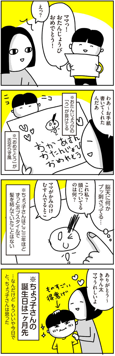 きゃん太のミステイク 2016.02.24 日常漫画 息子きゃん太・幼稚園児 ママの誕生日 きゃん太からの手紙、実物 3 コメントはこちら 同じカテゴリの記事 入園グッズ(布もの)の準備【コノビー掲載漫画】 セレモニースーツ、どうする?【コノビー掲載漫画】 我が家のサンタヒストリー その5 我が家のサンタヒストリー その4 我が家のサンタヒストリー その3 我が家のサンタヒストリー その2 我が家のサンタヒストリー その1 いつから一人で寝られる?【コノビー掲載漫画】 我が家のハロウィン【コノビー掲載漫画】 初めての授乳の思い出【コノビー掲載漫画】 坊ちゃん刈りからの卒業【コノビー掲載漫画】 胎毛筆の思い出【コノビー掲載漫画】 きゃん太(小2)との日常【コノビー掲載漫画】 ホクロを取った話 その3 ホクロを取った話 その2 ホクロを取った話 その1 ミニトマトの名前 バレンタイン2024 MUGON 粉瘤の話2(後編) 粉瘤の話2(前編) アニメ「進撃の巨人」最終回と我が家(後編) アニメ「進撃の巨人」最終回と我が家(前編) 修学旅行のお土産 だからなんだ絵日記 2023年7~8月 きゃん太と夏休みの宿題 初めてのバイトとカズヨシ【後編】 初めてのバイトとカズヨシ【前編】 クールアンドドライきゃん太 12の夜 映画「THE FIRST SLAM DUNK」観てきた がも 春休みのきゃん太 私が◯◯になっても+お知らせ(レタスクラブ) 節分2023 きゃん太からの苦言 パッキンを届けたら その2 パッキンを届けたら その1 カズヨシ・80歳 その2 カズヨシ・80歳 その1 きゃん太の謎発言とLINEスタンプの宣伝 あだ名クイズ きゃん太の成長期 2年ぶりの健康診断 ちょっ子ちゃん〜顔のケガの思い出 後編〜 ちょっ子ちゃん〜顔のケガの思い出 前編〜 きゃん太の忘れもの きゃん太という男 粉瘤の話 猫の名前 そんなんじゃない きゃん太とセミ きゃん太と若冲 きゃん太の気がかりなこと 都道府県を体で表現する遊び ケーキの代わり きゃん太と進撃の巨人 アニメ「進撃の巨人」にハマった話 「劇場版 鬼滅の刃 無限列車編」観てきた Switchで桃鉄始めました きゃん太と鬼滅の刃 キングダムにハマった家族の風景 母の靴(3) 母の靴(2) 母の靴 (1) 最近のスタイル2 最近のスタイル こわいよ こわいよ きゃん太の夢(9歳現在) 続々・気を遣うきゃん太 ケンカの仲裁 誕生日のプレゼント 毛穴の話 休校中のきゃん太 つないだ手 2020年 年始のきゃん太 クリスマスのお菓子 オオサンショウウオ(の ぬいぐるみ)が来た 予防接種にて〜2019〜 気になる帽子 愛のことば きゃん太のアダ名センス 父の愛4 ママの代わりに バイトの思い出 ゲーム中のきゃん太 カズヨシ・メソッド(後編) カズヨシ・メソッド(前編)とウーマンエキサイト挿絵 母の日のこと 2019 GWの思い出 きゃん太と新元号+ウーマンエキサイト記事挿絵 きゃん太と漢字 ボヘミアンラプソディとバナナフィッシュ きゃん太の不安 初詣ときゃん太 続・気を遣うきゃん太 気を遣うきゃん太 ちょっ子ちゃん〜氷砂糖の思い出 後編〜 ちょっ子ちゃん〜氷砂糖の思い出 前編〜 きゃん太のボキャブラリー きゃん太、迷子になる② きゃん太、迷子になる① きゃん太へのごほうび アキラさんの口笛 ◯◯◯◯の呼び方 恐竜の夏 きゃん太の言い回し きゃん太のジャスティス 父の愛3 アヒル口 きゃん太の反抗期 小僧ずラブ おなかがいたい きゃん太との再会 オトナなきゃん太 ママと結婚できなくても きゃん太とインフルエンザ 雪の日のきゃん太 ちょっ子ちゃん〜カズヨシとクリスマス後編〜 ちょっ子ちゃん 〜カズヨシとクリスマス前編〜 サンタへの感謝 ウォーキングデッド脳 きゃん太と相撲 笑顔を見せて アキラさんと腹筋ベルト(+ウォーキングデッドの話) if 〜もしも〜(+ウパ男の話) きゃん太の変化 きゃん太と運動会のお弁当 きゃん太の落ち着く香り ふたりの暗号 きゃん太のツッコミ きゃん太とサプライズ おっちゃんの似顔絵 あのころは 化石発掘体験 きゃん太のお泊まり おしりペンペン 新しい服 虫採りの流儀 僕はやってない どう思ってるの きゃん太の夢 父の愛2 二人の秘密 きゃん太のあっちむいてホイ ゆうすけくん 父の愛 きゃん太のごっこ遊び さいごの日 おやすみのチュー きゃん太と自転車 あたらしい言葉 PPAP きゃん太ver. パパの呼び方 豆まきの意義 予防接種にて ちょっ子さんの失敗 人間嫌い 言ってほしい ちょっ子さんちのクリスマス② ちょっ子さんちのクリスマス① きゃん太とあこがれの人② きゃん太とあこがれの人 言いたいこと 立派な◯◯◯ 女子ときゃん太とブログ一周年 きゃん太の芸の道 ちょっ子さんの秘密 ママの料理 きゃん太・その愛 〜2016 秋〜 まりやちゃんの想い きゃん太とロボザウルス トイレに行きたい きゃん太の学び 断乳した時の話 ママのおなかは 愛と裏切りのきゃん太 きゃん太と買い物 恐怖の夜 夏のアキラさん 父の肖像 きゃん太の新技 言うと思った 噛まずに言えるかな アキラさんのダイエット 大人の階段登るきゃん太 きゃん太とお絵描き きゃん太の腕相撲 カズヨシという男(父の日の思い出)