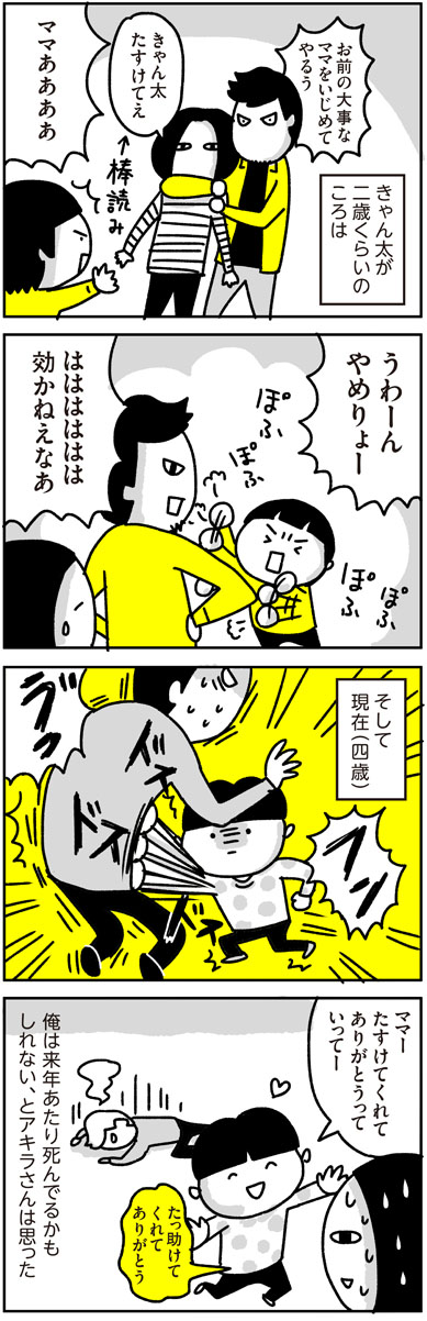 4歳児の力 2016.02.28 日常漫画 夫アキラ, 息子きゃん太・乳幼児期, 息子きゃん太・幼稚園児 成長 あとがき 腰の入ったパンチを繰り出すようになりました。 2 コメントはこちら 同じカテゴリの記事 入園グッズ(布もの)の準備【コノビー掲載漫画】 セレモニースーツ、どうする?【コノビー掲載漫画】 我が家のサンタヒストリー その5 我が家のサンタヒストリー その4 我が家のサンタヒストリー その3 我が家のサンタヒストリー その2 我が家のサンタヒストリー その1 いつから一人で寝られる?【コノビー掲載漫画】 我が家のハロウィン【コノビー掲載漫画】 初めての授乳の思い出【コノビー掲載漫画】 坊ちゃん刈りからの卒業【コノビー掲載漫画】 胎毛筆の思い出【コノビー掲載漫画】 きゃん太(小2)との日常【コノビー掲載漫画】 ホクロを取った話 その3 ホクロを取った話 その2 ホクロを取った話 その1 ミニトマトの名前 バレンタイン2024 MUGON 粉瘤の話2(後編) 粉瘤の話2(前編) アニメ「進撃の巨人」最終回と我が家(後編) アニメ「進撃の巨人」最終回と我が家(前編) 修学旅行のお土産 だからなんだ絵日記 2023年7~8月 きゃん太と夏休みの宿題 初めてのバイトとカズヨシ【後編】 初めてのバイトとカズヨシ【前編】 クールアンドドライきゃん太 12の夜 映画「THE FIRST SLAM DUNK」観てきた がも 春休みのきゃん太 私が◯◯になっても+お知らせ(レタスクラブ) 節分2023 きゃん太からの苦言 パッキンを届けたら その2 パッキンを届けたら その1 カズヨシ・80歳 その2 カズヨシ・80歳 その1 きゃん太の謎発言とLINEスタンプの宣伝 あだ名クイズ きゃん太の成長期 2年ぶりの健康診断 ちょっ子ちゃん〜顔のケガの思い出 後編〜 ちょっ子ちゃん〜顔のケガの思い出 前編〜 きゃん太の忘れもの きゃん太という男 粉瘤の話 猫の名前 そんなんじゃない きゃん太とセミ きゃん太と若冲 きゃん太の気がかりなこと 都道府県を体で表現する遊び ケーキの代わり きゃん太と進撃の巨人 アニメ「進撃の巨人」にハマった話 「劇場版 鬼滅の刃 無限列車編」観てきた Switchで桃鉄始めました きゃん太と鬼滅の刃 キングダムにハマった家族の風景 母の靴(3) 母の靴(2) 母の靴 (1) 最近のスタイル2 最近のスタイル こわいよ こわいよ きゃん太の夢(9歳現在) 続々・気を遣うきゃん太 ケンカの仲裁 誕生日のプレゼント 毛穴の話 休校中のきゃん太 つないだ手 2020年 年始のきゃん太 クリスマスのお菓子 オオサンショウウオ(の ぬいぐるみ)が来た 予防接種にて〜2019〜 気になる帽子 愛のことば きゃん太のアダ名センス 父の愛4 ママの代わりに バイトの思い出 ゲーム中のきゃん太 カズヨシ・メソッド(後編) カズヨシ・メソッド(前編)とウーマンエキサイト挿絵 母の日のこと 2019 GWの思い出 きゃん太と新元号+ウーマンエキサイト記事挿絵 きゃん太と漢字 ボヘミアンラプソディとバナナフィッシュ きゃん太の不安 初詣ときゃん太 続・気を遣うきゃん太 気を遣うきゃん太 ちょっ子ちゃん〜氷砂糖の思い出 後編〜 ちょっ子ちゃん〜氷砂糖の思い出 前編〜 きゃん太のボキャブラリー きゃん太、迷子になる② きゃん太、迷子になる① きゃん太へのごほうび アキラさんの口笛 ◯◯◯◯の呼び方 恐竜の夏 きゃん太の言い回し きゃん太のジャスティス 父の愛3 アヒル口 きゃん太の反抗期 小僧ずラブ おなかがいたい きゃん太との再会 オトナなきゃん太 ママと結婚できなくても きゃん太とインフルエンザ 雪の日のきゃん太 ちょっ子ちゃん〜カズヨシとクリスマス後編〜 ちょっ子ちゃん 〜カズヨシとクリスマス前編〜 サンタへの感謝 ウォーキングデッド脳 きゃん太と相撲 笑顔を見せて アキラさんと腹筋ベルト(+ウォーキングデッドの話) if 〜もしも〜(+ウパ男の話) きゃん太の変化 きゃん太と運動会のお弁当 きゃん太の落ち着く香り ふたりの暗号 きゃん太のツッコミ きゃん太とサプライズ おっちゃんの似顔絵 あのころは 化石発掘体験 きゃん太のお泊まり おしりペンペン 新しい服 虫採りの流儀 僕はやってない どう思ってるの きゃん太の夢 父の愛2 二人の秘密 きゃん太のあっちむいてホイ ゆうすけくん 父の愛 きゃん太のごっこ遊び さいごの日 おやすみのチュー きゃん太と自転車 あたらしい言葉 PPAP きゃん太ver. パパの呼び方 豆まきの意義 予防接種にて ちょっ子さんの失敗 人間嫌い 言ってほしい ちょっ子さんちのクリスマス② ちょっ子さんちのクリスマス① きゃん太とあこがれの人② きゃん太とあこがれの人 言いたいこと 立派な◯◯◯ 女子ときゃん太とブログ一周年 きゃん太の芸の道 ちょっ子さんの秘密 ママの料理 きゃん太・その愛 〜2016 秋〜 まりやちゃんの想い きゃん太とロボザウルス トイレに行きたい きゃん太の学び 断乳した時の話 ママのおなかは 愛と裏切りのきゃん太 きゃん太と買い物 恐怖の夜 夏のアキラさん 父の肖像 きゃん太の新技 言うと思った 噛まずに言えるかな アキラさんのダイエット 大人の階段登るきゃん太 きゃん太とお絵描き きゃん