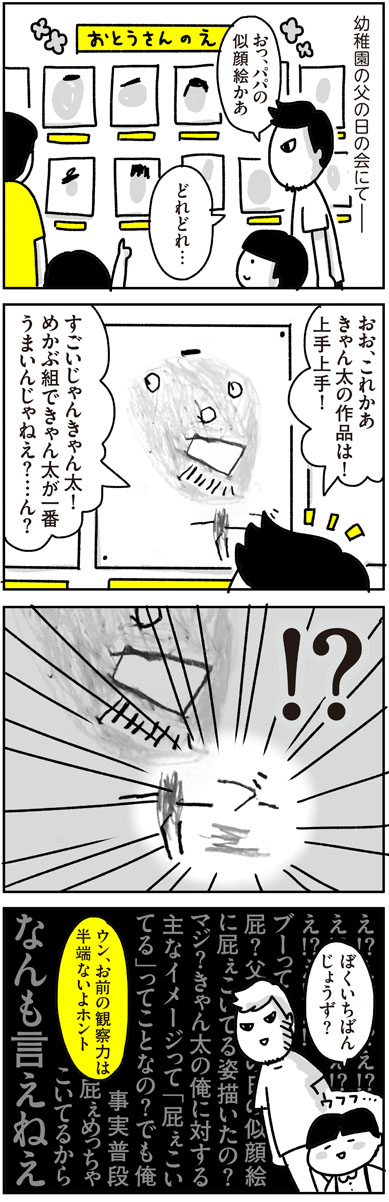 父の肖像 2016.07.22 日常漫画 夫アキラ, 息子きゃん太・幼稚園児 幼稚園の父の日イベント あとがき 本人に一応確認してみましたが、 やはり「パパがおならしてるとこ」だと 汚れなき瞳で答えてくれました。 なんだかんだでアキラさんは嬉しそうでしたよ。 3 コメントはこちら 同じカテゴリの記事 入園グッズ(布もの)の準備【コノビー掲載漫画】 セレモニースーツ、どうする?【コノビー掲載漫画】 我が家のサンタヒストリー その5 我が家のサンタヒストリー その4 我が家のサンタヒストリー その3 我が家のサンタヒストリー その2 我が家のサンタヒストリー その1 いつから一人で寝られる?【コノビー掲載漫画】 我が家のハロウィン【コノビー掲載漫画】 初めての授乳の思い出【コノビー掲載漫画】 坊ちゃん刈りからの卒業【コノビー掲載漫画】 胎毛筆の思い出【コノビー掲載漫画】 きゃん太(小2)との日常【コノビー掲載漫画】 ホクロを取った話 その3 ホクロを取った話 その2 ホクロを取った話 その1 ミニトマトの名前 バレンタイン2024 MUGON 粉瘤の話2(後編) 粉瘤の話2(前編) アニメ「進撃の巨人」最終回と我が家(後編) アニメ「進撃の巨人」最終回と我が家(前編) 修学旅行のお土産 だからなんだ絵日記 2023年7~8月 きゃん太と夏休みの宿題 初めてのバイトとカズヨシ【後編】 初めてのバイトとカズヨシ【前編】 クールアンドドライきゃん太 12の夜 映画「THE FIRST SLAM DUNK」観てきた がも 春休みのきゃん太 私が◯◯になっても+お知らせ(レタスクラブ) 節分2023 きゃん太からの苦言 パッキンを届けたら その2 パッキンを届けたら その1 カズヨシ・80歳 その2 カズヨシ・80歳 その1 きゃん太の謎発言とLINEスタンプの宣伝 あだ名クイズ きゃん太の成長期 2年ぶりの健康診断 ちょっ子ちゃん〜顔のケガの思い出 後編〜 ちょっ子ちゃん〜顔のケガの思い出 前編〜 きゃん太の忘れもの きゃん太という男 粉瘤の話 猫の名前 そんなんじゃない きゃん太とセミ きゃん太と若冲 きゃん太の気がかりなこと 都道府県を体で表現する遊び ケーキの代わり きゃん太と進撃の巨人 アニメ「進撃の巨人」にハマった話 「劇場版 鬼滅の刃 無限列車編」観てきた Switchで桃鉄始めました きゃん太と鬼滅の刃 キングダムにハマった家族の風景 母の靴(3) 母の靴(2) 母の靴 (1) 最近のスタイル2 最近のスタイル こわいよ こわいよ きゃん太の夢(9歳現在) 続々・気を遣うきゃん太 ケンカの仲裁 誕生日のプレゼント 毛穴の話 休校中のきゃん太 つないだ手 2020年 年始のきゃん太 クリスマスのお菓子 オオサンショウウオ(の ぬいぐるみ)が来た 予防接種にて〜2019〜 気になる帽子 愛のことば きゃん太のアダ名センス 父の愛4 ママの代わりに バイトの思い出 ゲーム中のきゃん太 カズヨシ・メソッド(後編) カズヨシ・メソッド(前編)とウーマンエキサイト挿絵 母の日のこと 2019 GWの思い出 きゃん太と新元号+ウーマンエキサイト記事挿絵 きゃん太と漢字 ボヘミアンラプソディとバナナフィッシュ きゃん太の不安 初詣ときゃん太 続・気を遣うきゃん太 気を遣うきゃん太 ちょっ子ちゃん〜氷砂糖の思い出 後編〜 ちょっ子ちゃん〜氷砂糖の思い出 前編〜 きゃん太のボキャブラリー きゃん太、迷子になる② きゃん太、迷子になる① きゃん太へのごほうび アキラさんの口笛 ◯◯◯◯の呼び方 恐竜の夏 きゃん太の言い回し きゃん太のジャスティス 父の愛3 アヒル口 きゃん太の反抗期 小僧ずラブ おなかがいたい きゃん太との再会 オトナなきゃん太 ママと結婚できなくても きゃん太とインフルエンザ 雪の日のきゃん太 ちょっ子ちゃん〜カズヨシとクリスマス後編〜 ちょっ子ちゃん 〜カズヨシとクリスマス前編〜 サンタへの感謝 ウォーキングデッド脳 きゃん太と相撲 笑顔を見せて アキラさんと腹筋ベルト(+ウォーキングデッドの話) if 〜もしも〜(+ウパ男の話) きゃん太の変化 きゃん太と運動会のお弁当 きゃん太の落ち着く香り ふたりの暗号 きゃん太のツッコミ きゃん太とサプライズ おっちゃんの似顔絵 あのころは 化石発掘体験 きゃん太のお泊まり おしりペンペン 新しい服 虫採りの流儀 僕はやってない どう思ってるの きゃん太の夢 父の愛2 二人の秘密 きゃん太のあっちむいてホイ ゆうすけくん 父の愛 きゃん太のごっこ遊び さいごの日 おやすみのチュー きゃん太と自転車 あたらしい言葉 PPAP きゃん太ver. パパの呼び方 豆まきの意義 予防接種にて ちょっ子さんの失敗 人間嫌い 言ってほしい ちょっ子さんちのクリスマス② ちょっ子さんちのクリスマス① きゃん太とあこがれの人② きゃん太とあこがれの人 言いたいこと 立派な◯◯◯ 女子ときゃん太とブログ一周年 きゃん太の芸の道 ちょっ子さんの秘密 ママの料理 きゃん太・その愛 〜2016 秋〜 まりやちゃんの想い きゃん太とロボザウルス トイレに行きたい きゃん太の学び 断乳した時の話 ママのおなかは 愛と裏切りのきゃん太 きゃん太と買い物 恐怖の夜 夏のアキラさん 父の肖像 きゃん太の新技 言うと思