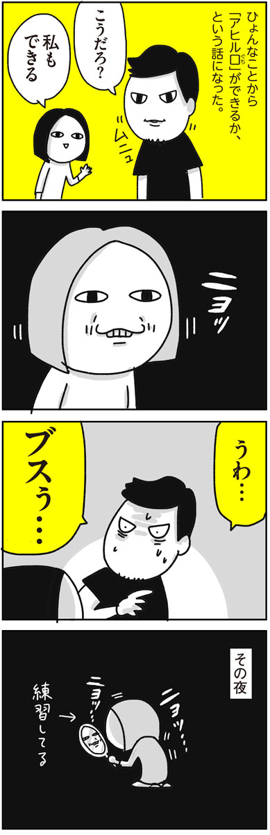 アヒル口 2018.06.01 日常漫画 夫アキラ アヒル口 あとがき ブス言うな。 今はどうだか知りませんが、 昔、アヒル口って流行ってたんですよ。 口をアヒルのくちばしみたいにムニュってやると可愛く見えるんですって…。 そして私は、自分がアヒル口ができないことにこの日初めて気づいたのです。 そもそもそんな歳にもなって アヒル口にチャレンジするなって話なんですけど。 3 コメントはこちら 同じカテゴリの記事 入園グッズ(布もの)の準備【コノビー掲載漫画】 セレモニースーツ、どうする?【コノビー掲載漫画】 我が家のサンタヒストリー その5 我が家のサンタヒストリー その4 我が家のサンタヒストリー その3 我が家のサンタヒストリー その2 我が家のサンタヒストリー その1 いつから一人で寝られる?【コノビー掲載漫画】 我が家のハロウィン【コノビー掲載漫画】 初めての授乳の思い出【コノビー掲載漫画】 坊ちゃん刈りからの卒業【コノビー掲載漫画】 胎毛筆の思い出【コノビー掲載漫画】 きゃん太(小2)との日常【コノビー掲載漫画】 ホクロを取った話 その3 ホクロを取った話 その2 ホクロを取った話 その1 ミニトマトの名前 バレンタイン2024 MUGON 粉瘤の話2(後編) 粉瘤の話2(前編) アニメ「進撃の巨人」最終回と我が家(後編) アニメ「進撃の巨人」最終回と我が家(前編) 修学旅行のお土産 だからなんだ絵日記 2023年7~8月 きゃん太と夏休みの宿題 初めてのバイトとカズヨシ【後編】 初めてのバイトとカズヨシ【前編】 クールアンドドライきゃん太 12の夜 映画「THE FIRST SLAM DUNK」観てきた がも 春休みのきゃん太 私が◯◯になっても+お知らせ(レタスクラブ) 節分2023 きゃん太からの苦言 パッキンを届けたら その2 パッキンを届けたら その1 カズヨシ・80歳 その2 カズヨシ・80歳 その1 きゃん太の謎発言とLINEスタンプの宣伝 あだ名クイズ きゃん太の成長期 2年ぶりの健康診断 ちょっ子ちゃん〜顔のケガの思い出 後編〜 ちょっ子ちゃん〜顔のケガの思い出 前編〜 きゃん太の忘れもの きゃん太という男 粉瘤の話 猫の名前 そんなんじゃない きゃん太とセミ きゃん太と若冲 きゃん太の気がかりなこと 都道府県を体で表現する遊び ケーキの代わり きゃん太と進撃の巨人 アニメ「進撃の巨人」にハマった話 「劇場版 鬼滅の刃 無限列車編」観てきた Switchで桃鉄始めました きゃん太と鬼滅の刃 キングダムにハマった家族の風景 母の靴(3) 母の靴(2) 母の靴 (1) 最近のスタイル2 最近のスタイル こわいよ こわいよ きゃん太の夢(9歳現在) 続々・気を遣うきゃん太 ケンカの仲裁 誕生日のプレゼント 毛穴の話 休校中のきゃん太 つないだ手 2020年 年始のきゃん太 クリスマスのお菓子 オオサンショウウオ(の ぬいぐるみ)が来た 予防接種にて〜2019〜 気になる帽子 愛のことば きゃん太のアダ名センス 父の愛4 ママの代わりに バイトの思い出 ゲーム中のきゃん太 カズヨシ・メソッド(後編) カズヨシ・メソッド(前編)とウーマンエキサイト挿絵 母の日のこと 2019 GWの思い出 きゃん太と新元号+ウーマンエキサイト記事挿絵 きゃん太と漢字 ボヘミアンラプソディとバナナフィッシュ きゃん太の不安 初詣ときゃん太 続・気を遣うきゃん太 気を遣うきゃん太 ちょっ子ちゃん〜氷砂糖の思い出 後編〜 ちょっ子ちゃん〜氷砂糖の思い出 前編〜 きゃん太のボキャブラリー きゃん太、迷子になる② きゃん太、迷子になる① きゃん太へのごほうび アキラさんの口笛 ◯◯◯◯の呼び方 恐竜の夏 きゃん太の言い回し きゃん太のジャスティス 父の愛3 アヒル口 きゃん太の反抗期 小僧ずラブ おなかがいたい きゃん太との再会 オトナなきゃん太 ママと結婚できなくても きゃん太とインフルエンザ 雪の日のきゃん太 ちょっ子ちゃん〜カズヨシとクリスマス後編〜 ちょっ子ちゃん 〜カズヨシとクリスマス前編〜 サンタへの感謝 ウォーキングデッド脳 きゃん太と相撲 笑顔を見せて アキラさんと腹筋ベルト(+ウォーキングデッドの話) if 〜もしも〜(+ウパ男の話) きゃん太の変化 きゃん太と運動会のお弁当 きゃん太の落ち着く香り ふたりの暗号 きゃん太のツッコミ きゃん太とサプライズ おっちゃんの似顔絵 あのころは 化石発掘体験 きゃん太のお泊まり おしりペンペン 新しい服 虫採りの流儀 僕はやってない どう思ってるの きゃん太の夢 父の愛2 二人の秘密 きゃん太のあっちむいてホイ ゆうすけくん 父の愛 きゃん太のごっこ遊び さいごの日 おやすみのチュー きゃん太と自転車 あたらしい言葉 PPAP きゃん太ver. パパの呼び方 豆まきの意義 予防接種にて ちょっ子さんの失敗 人間嫌い 言ってほしい ちょっ子さんちのクリスマス② ちょっ子さんちのクリスマス① きゃん太とあこがれの人② きゃん太とあこがれの人 言いたいこと 立派な◯◯◯ 女子ときゃん太とブログ一周年 きゃん太の芸の道 ちょっ子さんの秘密 ママの料理 きゃん太・その愛 〜2016 秋〜 まりやちゃんの想い きゃん太とロボザウルス トイレに行きたい きゃん太の学び 断乳した時の