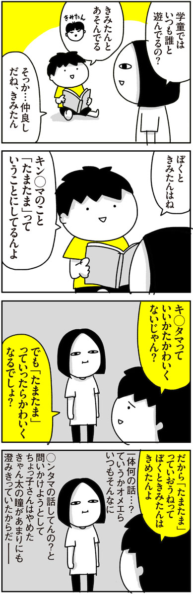 ◯◯◯◯の呼び方 2018.08.13 日常漫画 息子きゃん太・小学生 学童では あとがき きゃん太は学童保育に通っているので、何気なくこんな質問をしてみたら キ◯タマの呼び方について語ってくれました。 きみたんとは幼稚園からのお友達。 お互い一人っ子で、気性が似たところがあるのでしょうか? いつも仲良く遊んでいるようです。 1 コメントはこちら 同じカテゴリの記事 入園グッズ(布もの)の準備【コノビー掲載漫画】 セレモニースーツ、どうする?【コノビー掲載漫画】 我が家のサンタヒストリー その5 我が家のサンタヒストリー その4 我が家のサンタヒストリー その3 我が家のサンタヒストリー その2 我が家のサンタヒストリー その1 いつから一人で寝られる?【コノビー掲載漫画】 我が家のハロウィン【コノビー掲載漫画】 初めての授乳の思い出【コノビー掲載漫画】 坊ちゃん刈りからの卒業【コノビー掲載漫画】 胎毛筆の思い出【コノビー掲載漫画】 きゃん太(小2)との日常【コノビー掲載漫画】 ホクロを取った話 その3 ホクロを取った話 その2 ホクロを取った話 その1 ミニトマトの名前 バレンタイン2024 MUGON 粉瘤の話2(後編) 粉瘤の話2(前編) アニメ「進撃の巨人」最終回と我が家(後編) アニメ「進撃の巨人」最終回と我が家(前編) 修学旅行のお土産 だからなんだ絵日記 2023年7~8月 きゃん太と夏休みの宿題 初めてのバイトとカズヨシ【後編】 初めてのバイトとカズヨシ【前編】 クールアンドドライきゃん太 12の夜 映画「THE FIRST SLAM DUNK」観てきた がも 春休みのきゃん太 私が◯◯になっても+お知らせ(レタスクラブ) 節分2023 きゃん太からの苦言 パッキンを届けたら その2 パッキンを届けたら その1 カズヨシ・80歳 その2 カズヨシ・80歳 その1 きゃん太の謎発言とLINEスタンプの宣伝 あだ名クイズ きゃん太の成長期 2年ぶりの健康診断 ちょっ子ちゃん〜顔のケガの思い出 後編〜 ちょっ子ちゃん〜顔のケガの思い出 前編〜 きゃん太の忘れもの きゃん太という男 粉瘤の話 猫の名前 そんなんじゃない きゃん太とセミ きゃん太と若冲 きゃん太の気がかりなこと 都道府県を体で表現する遊び ケーキの代わり きゃん太と進撃の巨人 アニメ「進撃の巨人」にハマった話 「劇場版 鬼滅の刃 無限列車編」観てきた Switchで桃鉄始めました きゃん太と鬼滅の刃 キングダムにハマった家族の風景 母の靴(3) 母の靴(2) 母の靴 (1) 最近のスタイル2 最近のスタイル こわいよ こわいよ きゃん太の夢(9歳現在) 続々・気を遣うきゃん太 ケンカの仲裁 誕生日のプレゼント 毛穴の話 休校中のきゃん太 つないだ手 2020年 年始のきゃん太 クリスマスのお菓子 オオサンショウウオ(の ぬいぐるみ)が来た 予防接種にて〜2019〜 気になる帽子 愛のことば きゃん太のアダ名センス 父の愛4 ママの代わりに バイトの思い出 ゲーム中のきゃん太 カズヨシ・メソッド(後編) カズヨシ・メソッド(前編)とウーマンエキサイト挿絵 母の日のこと 2019 GWの思い出 きゃん太と新元号+ウーマンエキサイト記事挿絵 きゃん太と漢字 ボヘミアンラプソディとバナナフィッシュ きゃん太の不安 初詣ときゃん太 続・気を遣うきゃん太 気を遣うきゃん太 ちょっ子ちゃん〜氷砂糖の思い出 後編〜 ちょっ子ちゃん〜氷砂糖の思い出 前編〜 きゃん太のボキャブラリー きゃん太、迷子になる② きゃん太、迷子になる① きゃん太へのごほうび アキラさんの口笛 ◯◯◯◯の呼び方 恐竜の夏 きゃん太の言い回し きゃん太のジャスティス 父の愛3 アヒル口 きゃん太の反抗期 小僧ずラブ おなかがいたい きゃん太との再会 オトナなきゃん太 ママと結婚できなくても きゃん太とインフルエンザ 雪の日のきゃん太 ちょっ子ちゃん〜カズヨシとクリスマス後編〜 ちょっ子ちゃん 〜カズヨシとクリスマス前編〜 サンタへの感謝 ウォーキングデッド脳 きゃん太と相撲 笑顔を見せて アキラさんと腹筋ベルト(+ウォーキングデッドの話) if 〜もしも〜(+ウパ男の話) きゃん太の変化 きゃん太と運動会のお弁当 きゃん太の落ち着く香り ふたりの暗号 きゃん太のツッコミ きゃん太とサプライズ おっちゃんの似顔絵 あのころは 化石発掘体験 きゃん太のお泊まり おしりペンペン 新しい服 虫採りの流儀 僕はやってない どう思ってるの きゃん太の夢 父の愛2 二人の秘密 きゃん太のあっちむいてホイ ゆうすけくん 父の愛 きゃん太のごっこ遊び さいごの日 おやすみのチュー きゃん太と自転車 あたらしい言葉 PPAP きゃん太ver. パパの呼び方 豆まきの意義 予防接種にて ちょっ子さんの失敗 人間嫌い 言ってほしい ちょっ子さんちのクリスマス② ちょっ子さんちのクリスマス① きゃん太とあこがれの人② きゃん太とあこがれの人 言いたいこと 立派な◯◯◯ 女子ときゃん太とブログ一周年 きゃん太の芸の道 ちょっ子さんの秘密 ママの料理 きゃん太・その愛 〜2016 秋〜 まりやちゃんの想い きゃん太とロボザウルス トイレに行きたい きゃん太の学び 断乳した時の話 ママのおなかは 愛と裏切りのきゃん太 きゃ