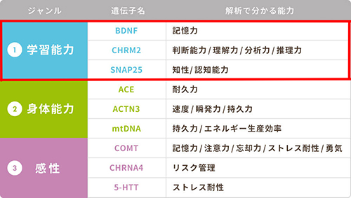 学習能力に関係する遺伝子三種類について解析してもらいます。