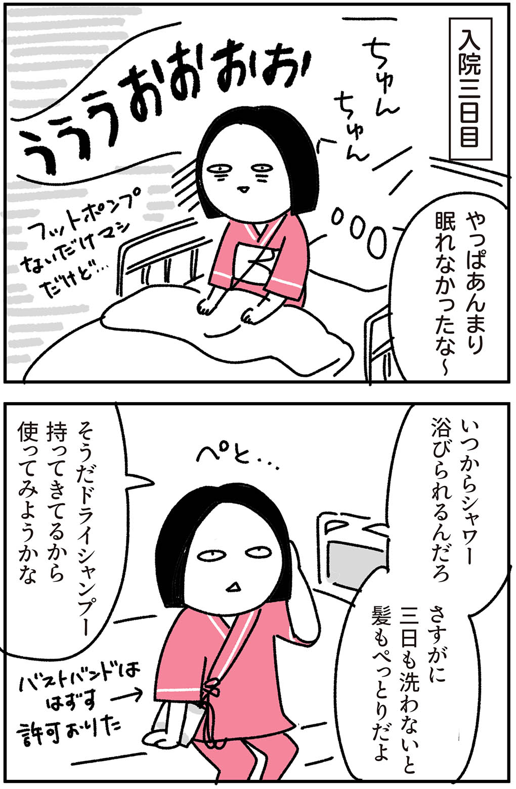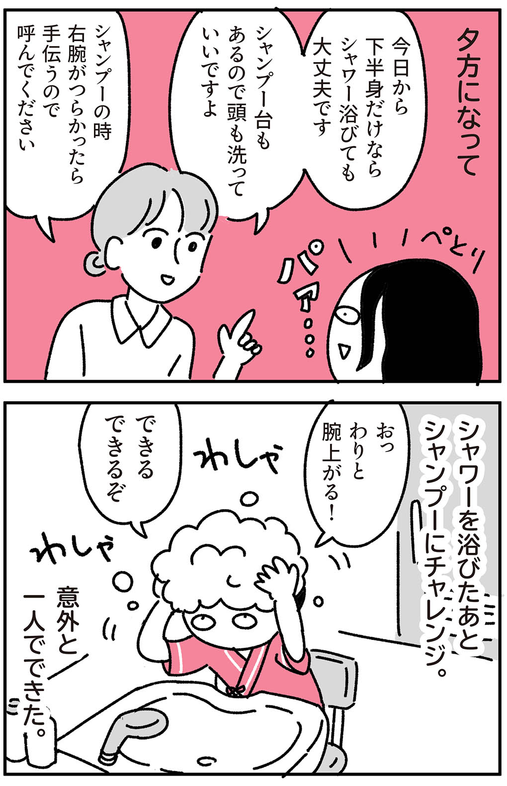 許可が降りるまでは温かい濡れタオルで体を拭くことしかできなかったので、三日ぶりのシャワー(下半身のみだけど)と洗髪が最高に気持ちよかったです。